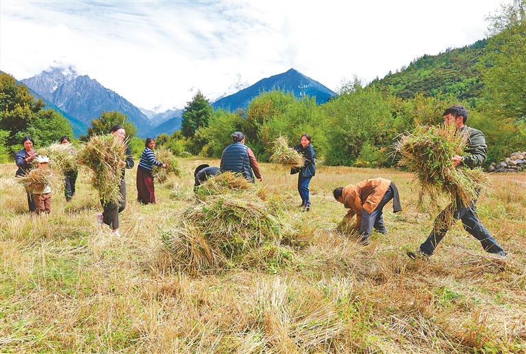 林芝市工布江達(dá)縣錯(cuò)高鄉(xiāng)結(jié)巴村村民秋收?qǐng)鼍?。記?白瑪澤旺 次仁平措 攝