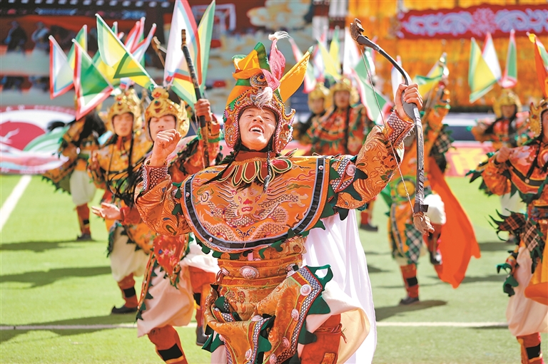 9月15日舉行的第十一屆三江茶馬文化藝術節(jié)開幕式上,來自昌都11個縣(區(qū))的群眾代表組成游行方隊,載歌載舞,繞場一周,熱烈激昂的丁青熱巴、豪邁威武的類烏齊嶺卓舞、優(yōu)美歡快的芒康弦子等非遺舞蹈,向現場的干部群眾和各界來賓展示了昌都獨特的傳統(tǒng)文化和熱情好客的真摯情誼。隨后的文藝表演以歌舞和情景劇的形式,從金沙江的紅色記憶,到怒江的文化傳承,再到瀾滄江的高質量發(fā)展之光,描摹出了昌都歷史文化的主要脈絡和經濟社會發(fā)展取得的巨大成就,為現場觀眾奉獻了一場難忘的文藝盛宴。