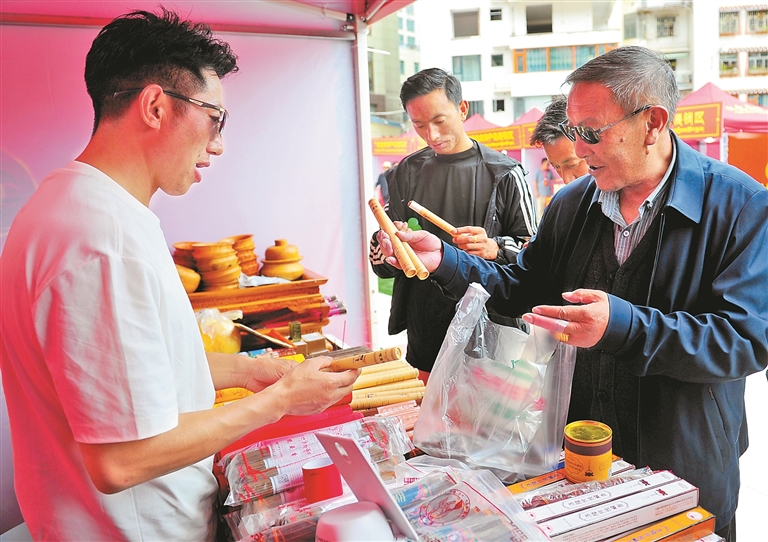 特色產品展銷柜臺,市民正在選購洛隆藏香。