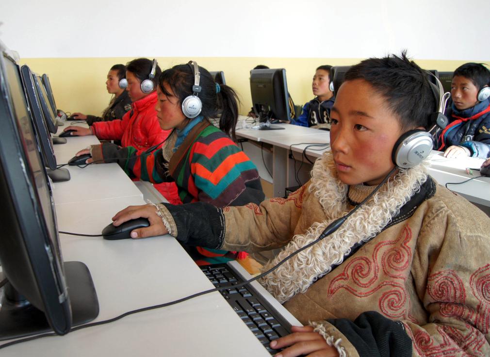 由中海油援建的尼瑪縣小學(xué)學(xué)生在上計算機(jī)課(2009年9月13日攝)。