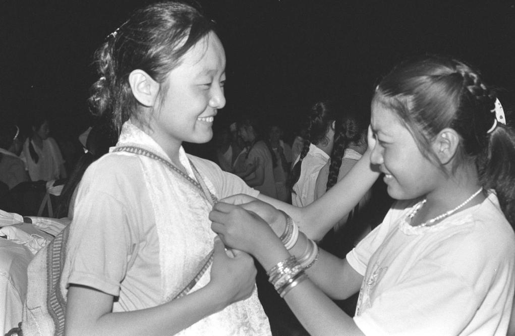 北京西藏中學(xué)首批93名藏族高中畢業(yè)生乘火車離京返藏。1991年入校的次仁卓嘎來到北京火車站為姐姐卓嘎送行。卓嘎是位品學(xué)兼優(yōu)的好學(xué)生。臨別前,她勉勵妹妹好好學(xué)習(xí)(1992年7月13日攝)。
