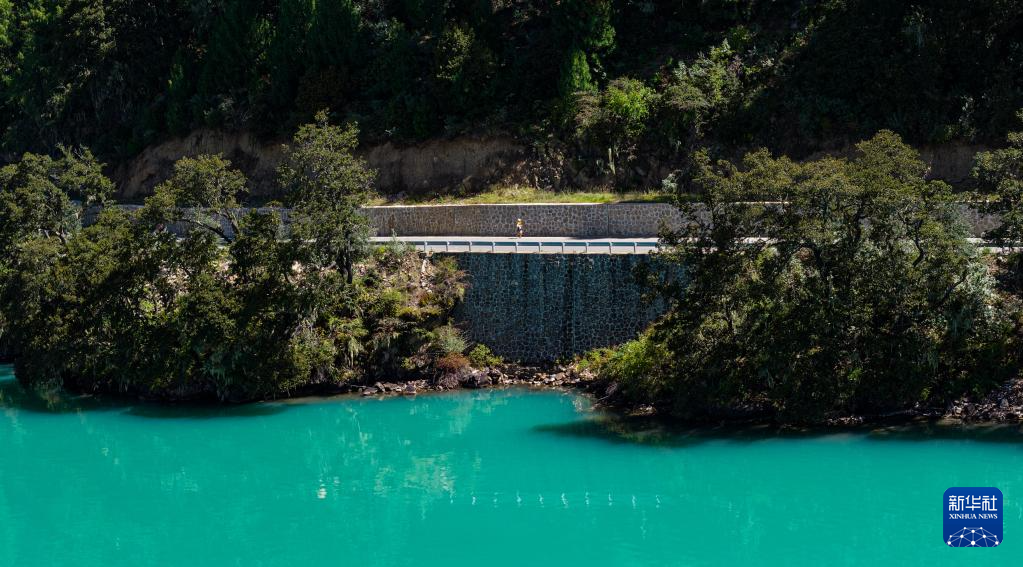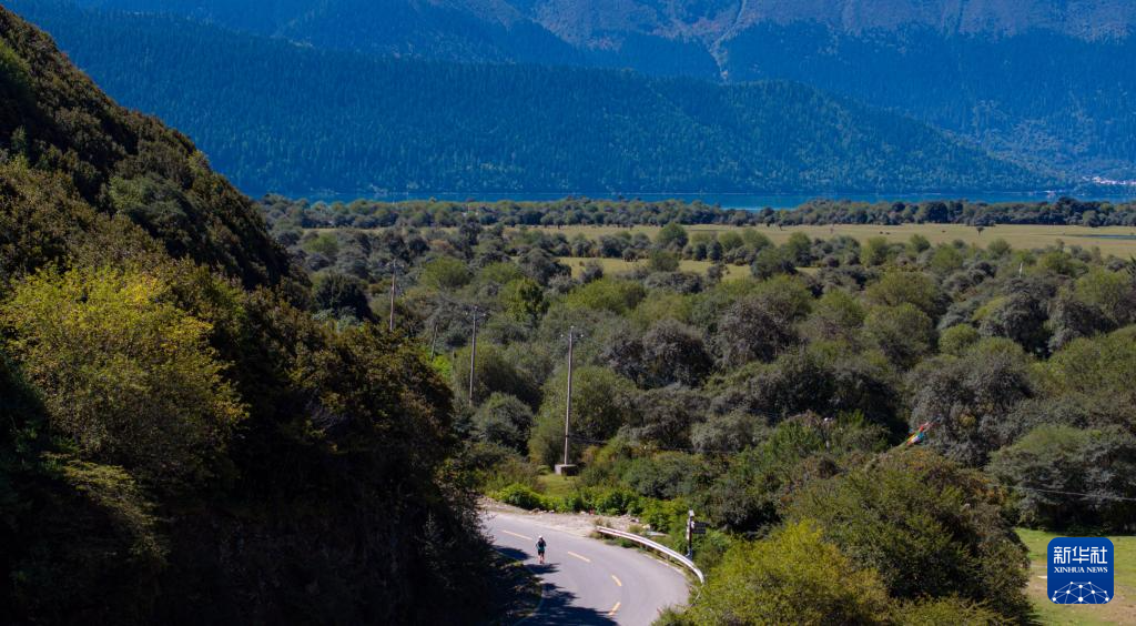 9月27日,參賽選手穿過巴松措濕地(無人機(jī)照片)。新華社記者 普布次仁 攝