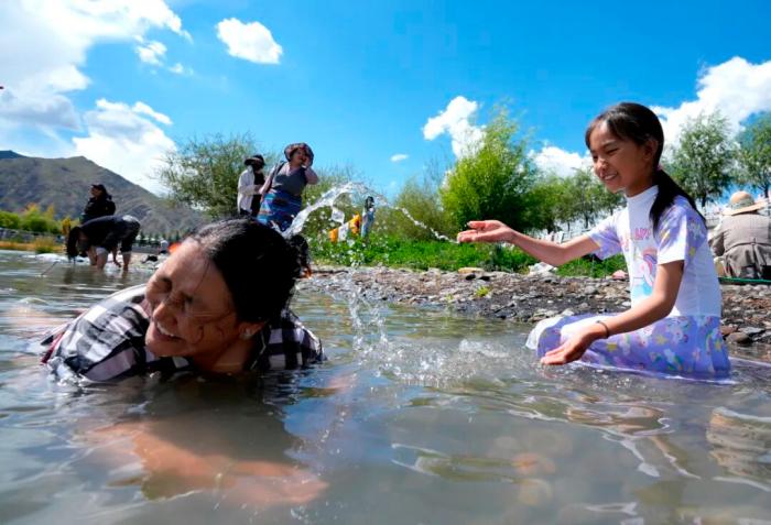 2025年9月13日,民眾在拉薩河邊享受沐浴節(jié)時(shí)光。沐浴節(jié),藏語稱為“嘎瑪日吉”。中新社記者 李林 攝
