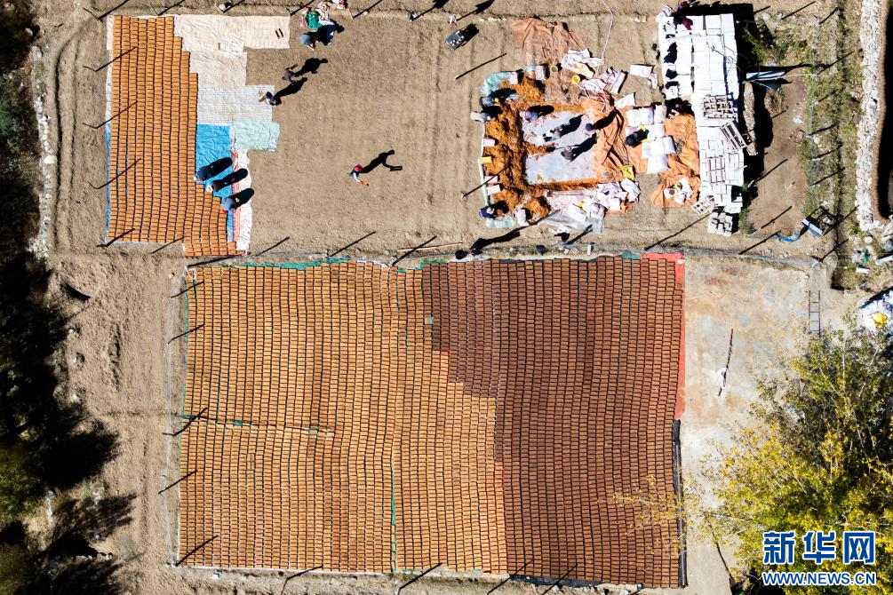 10月17日,西藏拉薩市尼木縣吞巴鎮(zhèn)吞達村村民把經(jīng)過水磨后的柏木漿制作成香磚(無人機照片)。新華網(wǎng) 旦增努布 攝