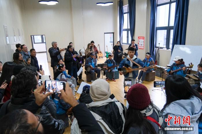 10月28日,拉美18個國家的21名記者、編輯等媒體從業(yè)者在西藏自治區(qū)林芝市巴宜區(qū)中學參訪,觀看師生們演奏藏族扎念琴。中新社記者 江飛波 攝