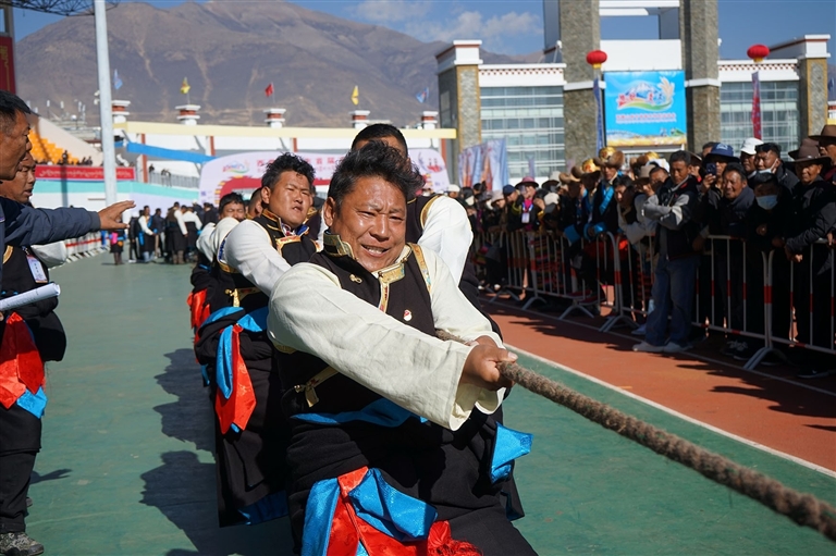 記者置身于賽場,最直觀的感受并非競技的緊張,而是一種蓬勃的生命力在盡情舒展。這里的比賽,吶喊聲帶著鄉(xiāng)音,勝利的歡呼與田間勞作時的號子相互呼應。在極具特色的“押加”比賽(即大象拔河)現(xiàn)場,來自隆子縣的扎西達杰成為全場的焦點。他穿著隆子縣的傳統(tǒng)服飾,面容質(zhì)樸神情嚴肅,裁判哨聲吹響,與對手反向?qū)乃查g,他全身的肌肉瞬間繃緊,四肢緊緊地“吸附”在地上,那是在千百次揮鎬、背負牧草中錘煉出的力量。僵持、角力,在鄉(xiāng)親的“加油”聲中,他猛然發(fā)力,贏得了比賽。