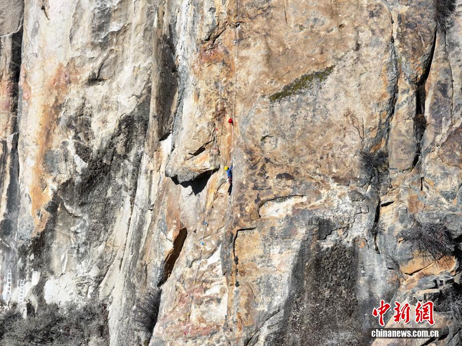 11月29日,2025西藏自治區(qū)攀巖自然巖壁公開(kāi)賽在拉薩市奪底溝吉倉(cāng)自然巖壁場(chǎng)地開(kāi)賽。來(lái)自中國(guó)全國(guó)的70名運(yùn)動(dòng)員、高校學(xué)生及社會(huì)攀巖愛(ài)好者參賽。(無(wú)人機(jī)照片)中新社記者 貢嘎來(lái)松 攝