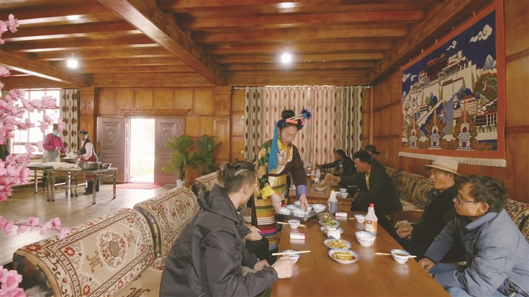 作為自治區(qū)級非遺傳承人、芒康縣“婦女致富帶頭人”的卓瑪拉姆,于2010年開辦鹽井果拉叢農(nóng)家樂,憑借著正宗的加加面風(fēng)味和熱情的服務(wù),逐漸積累了口碑。2012年,在各級政府的支持下,她采用“民族特色餐飲+鄉(xiāng)村旅游接待”的經(jīng)營模式,生意日益紅火。2017年,通過貸款300萬元、自籌160萬元翻建了農(nóng)家樂,將其升級為綜合型的民族特色餐飲店,經(jīng)營規(guī)模大幅擴(kuò)大,最多時(shí)日接待游客達(dá)300余人。