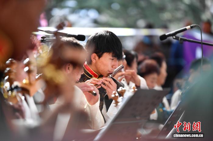 圖為群眾音樂會,民樂合奏《夏爾巴的歌聲》精彩上演。中新社記者 貢嘎來松 攝