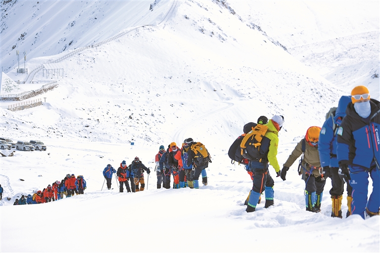 圖為5月2日,登山愛好者向洛堆峰峰頂進(jìn)發(fā)(資料圖片)。本報(bào)記者 潘多 鄭璐 明吉 攝影報(bào)道