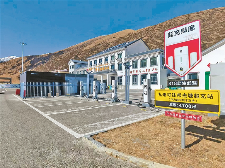 邦杰塘服務區(qū)停車場內的新能源汽車快充樁。通訊員 張成 多吉 攝