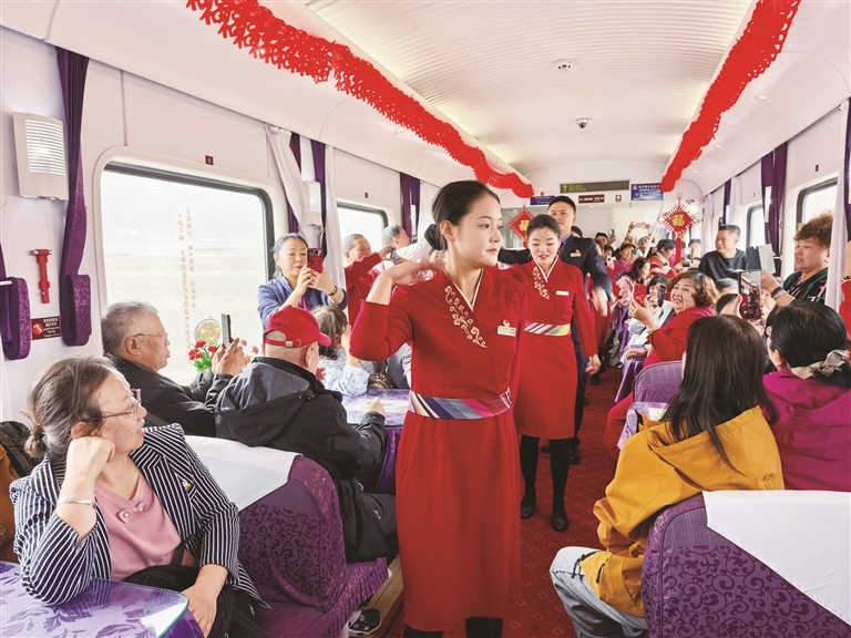 針對(duì)高原旅游特殊性及“銀發(fā)族”為主的客群特點(diǎn),中國(guó)鐵路青藏集團(tuán)有限公司持續(xù)升級(jí)服務(wù)保障體系,讓旅途兼具安全性與舒適度。車輛方面,該公司完成適老化與舒適化改造,打造2組普惠型旅游專用車組,入藏專列均采用全列有氧臥鋪車廂,配備彌散式供氧系統(tǒng)、專用發(fā)電車及精品餐車,有效緩解旅客高原反應(yīng)。服務(wù)方面,該公司組建“導(dǎo)游+乘務(wù)+醫(yī)護(hù)”三位一體復(fù)合型服務(wù)團(tuán)隊(duì),全程提供健康監(jiān)測(cè)、文化講解、應(yīng)急保障等全流程陪伴服務(wù);車廂內(nèi)以民族紋飾、剪紙窗花營(yíng)造地域氛圍,文藝小分隊(duì)沿途獻(xiàn)上藏族歌曲、舞蹈等特色表演,餐車則供應(yīng)烤羊腿、牦牛酸奶、特色奶茶等地方風(fēng)味美食,讓旅程更加舒適美好。運(yùn)營(yíng)模式上,該公司采用“晚上開(kāi)行、白天游玩、邊走邊?!钡脑O(shè)計(jì),途經(jīng)玉珠峰、沱沱河、羌塘草原等高原奇景,在海拔5072米的唐古拉站、措那湖等標(biāo)志性地點(diǎn)定點(diǎn)停靠,讓游客在休息中跨越山海,充分領(lǐng)略雪域風(fēng)光。同時(shí),該公司強(qiáng)化公鐵聯(lián)運(yùn)與景區(qū)接駁,推出“旅游小管家”一站式服務(wù),確保游客“行得順暢、吃得地道、玩得盡興”。