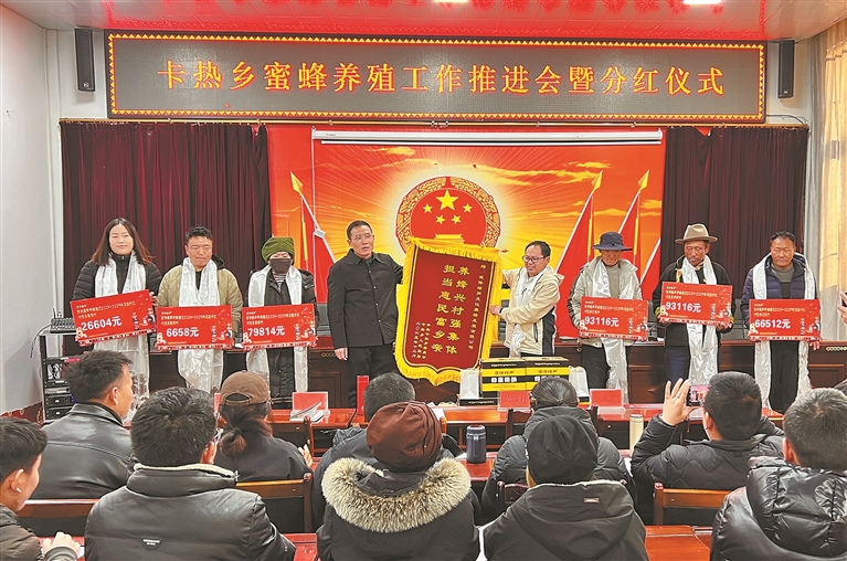 圖為浪卡子縣卡熱鄉(xiāng)舉行養(yǎng)蜂產(chǎn)業(yè)收益分紅儀式。