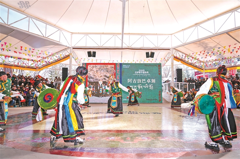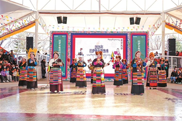 圖為2026拉薩新年服飾秀拉薩農牧民婦女代表“村T秀”宗角祿康公園活動現場。