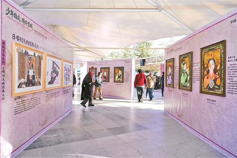 圖為市民游客在宗角祿康公園駐足觀賞“旖旎雪域”主題班珠丹塔服飾作品與插畫藝術展。