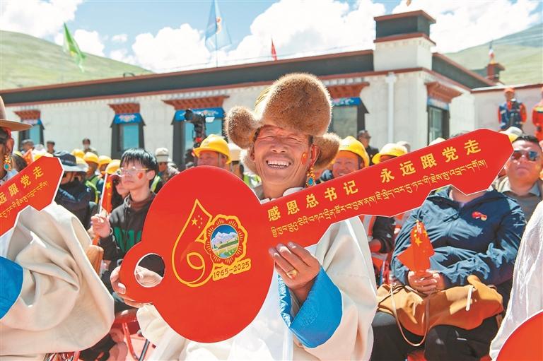 2025年8月15日,定日地震災(zāi)后恢復(fù)重建首批民房入住儀式現(xiàn)場(chǎng),群眾代表拿到新居“鑰匙”。西藏日?qǐng)?bào)記者 旦增嘎瓦 攝