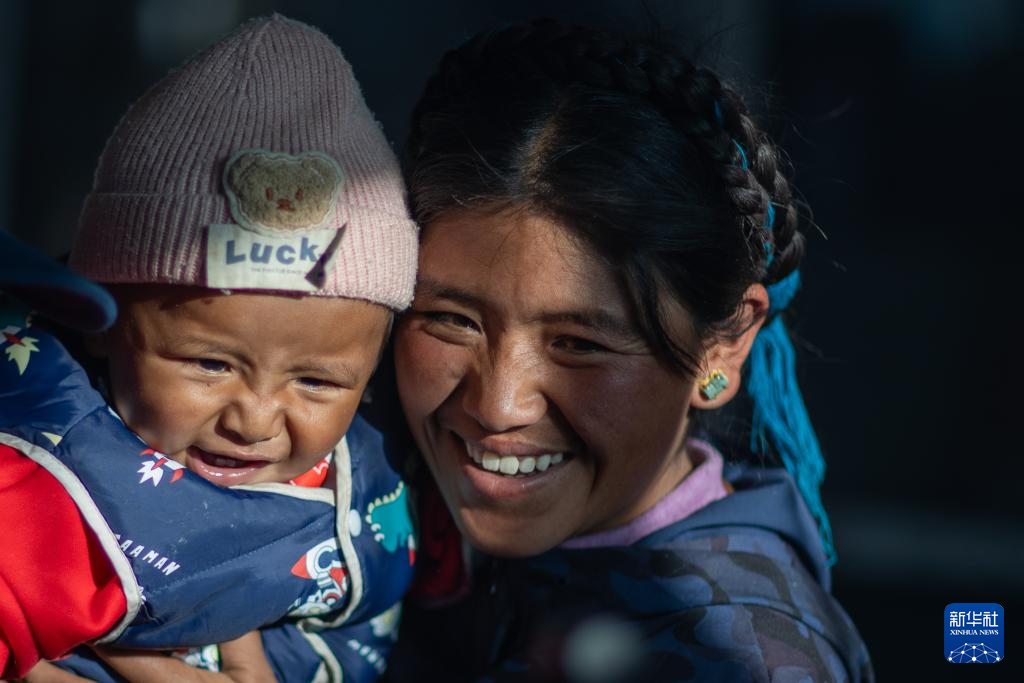 2025年11月11日,在西藏定日縣長(zhǎng)所鄉(xiāng)雜村,母親朋瓊在剛裝修好的新房中抱著次仁拉巴。新華社記者 姜帆 攝