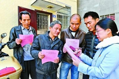 福建省福清市宏路街道紀檢干部(右一)在新倉村向村民分發(fā)黨員干部作風問卷調查表。新華社記者 張國俊攝