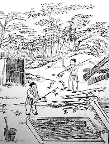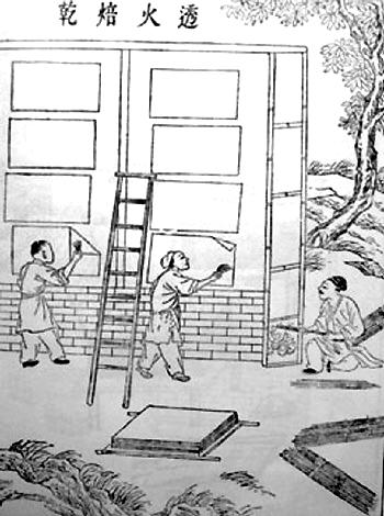 18世紀末,清乾隆年間由中國畫師手繪的竹紙制造全套工藝流程工筆設色組畫,由在京的法國耶穌會士蔣友仁寄往巴黎。竹紙制造系列圖共24幅,具有宮廷畫師畫風,因其兼具藝術和技術的雙重價值,在歐洲不斷被人臨摹。現(xiàn)知多套彩色摹本分別藏于巴黎國家圖書館、法蘭西研究院圖書館及德國萊比錫書籍博物館等地。1815年巴黎出版的《中國藝術、技術與文化圖說》中公布了其中的13幅,這些圖為后世有關造紙技術的專著爭相引用。此組畫重點向歐洲人展示了抄紙竹簾的型制及用法、濕紙人工干燥技術和植物黏液的使用等。明代宋應星的《天工開物》于18世紀傳到巴黎,1840年法蘭西學院漢學教授儒蓮將其中“殺青”(造紙)一章譯成法文,刊于《法蘭西科學院院刊》上,后又在另一刊物上發(fā)表了有關“竹紙制造”的論文。