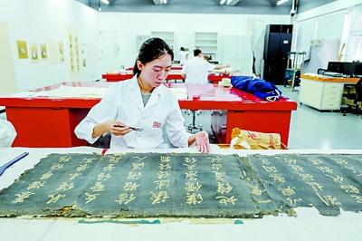 一名修復(fù)師在故宮文物醫(yī)院修復(fù)室修復(fù)故宮收藏的書(shū)法作品。新華社記者 劉潺攝