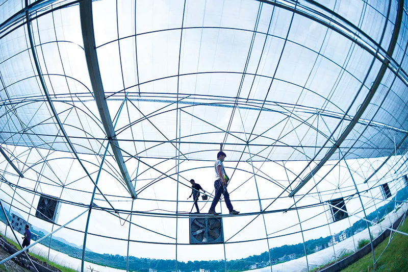 近年來(lái),湖北省恩施土家族苗族自治州宣恩縣大力發(fā)展“設(shè)施農(nóng)業(yè)”,通過(guò)企業(yè)、合作社、家庭農(nóng)場(chǎng)等將農(nóng)民手中的土地進(jìn)行流轉(zhuǎn),發(fā)展農(nóng)業(yè)觀光園和生態(tài)采摘園,為當(dāng)?shù)剞r(nóng)民開辟一條產(chǎn)業(yè)脫貧的新路。圖為宣恩縣李家河鎮(zhèn)二虎寨村,工人們?cè)诖罱乜卮笈铩?新華社記者 宋文/攝