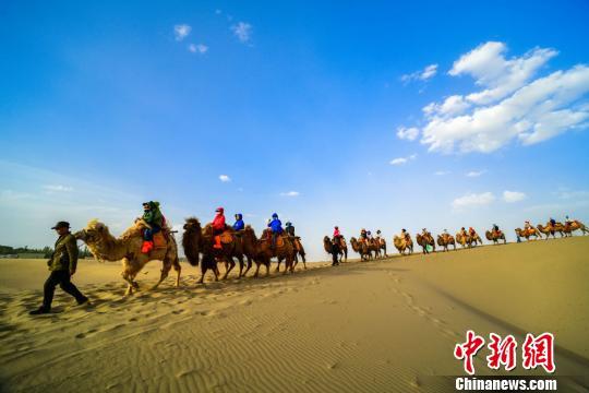 圖為大批游客騎駱駝體驗敦煌大漠風(fēng)光。 王斌銀 攝
