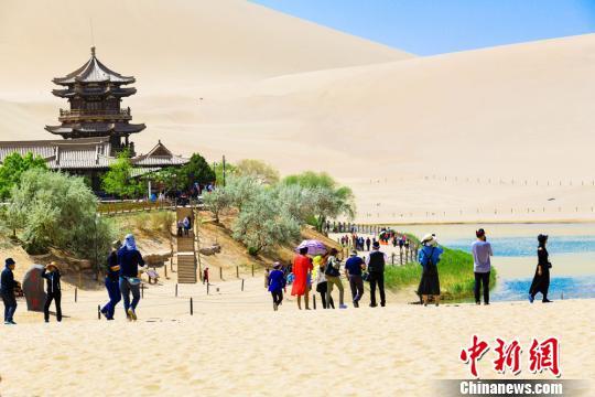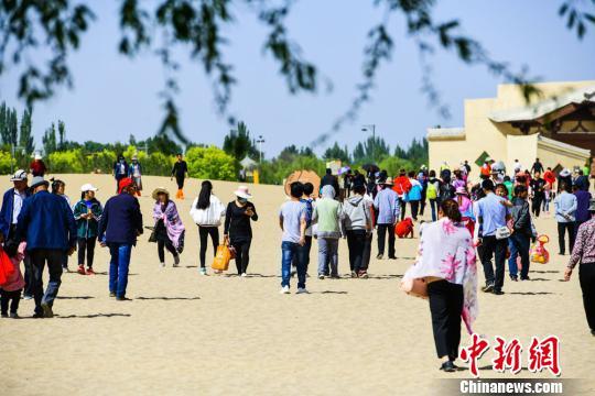 圖為5月1日,中外游客在鳴沙山月牙泉景區(qū)觀光游覽。 王斌銀 攝
