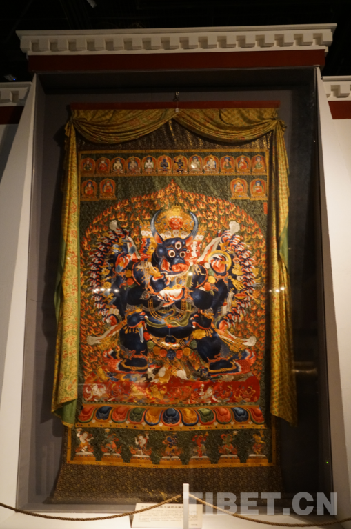 展覽專辟了一個區(qū)域展示西藏唐卡畫的發(fā)展衍生。其中,有一幅明永樂年間的刺繡大威德金剛唐卡堪稱“明星展品”。這幅高約4.3米的唐卡針線細(xì)膩,色彩鮮艷,造型生動,為密針疊線繡制手法。