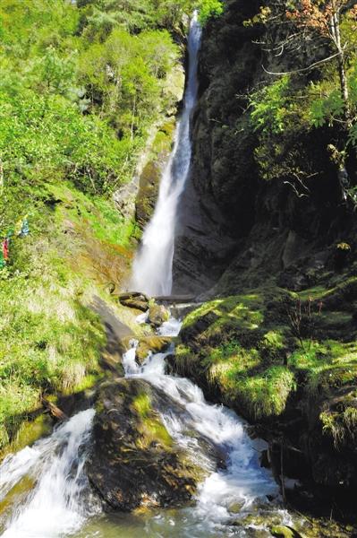 終于到了崗?fù)て俨?,飛濺的水花在陽(yáng)光下晶瑩剔透,與四周蔥郁的森林動(dòng)靜相宜。當(dāng)我們爬到山頂,也就是在第三層瀑布上時(shí),勒布溝又給了我們一個(gè)大大的驚喜——一道彩虹懸掛在瀑布旁邊,如夢(mèng)如幻,美不勝收。