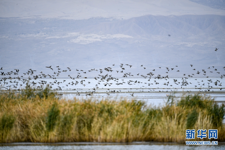 成群的赤麻鴨在海西州烏蘭縣都蘭湖國家濕地公園飛翔盤旋。