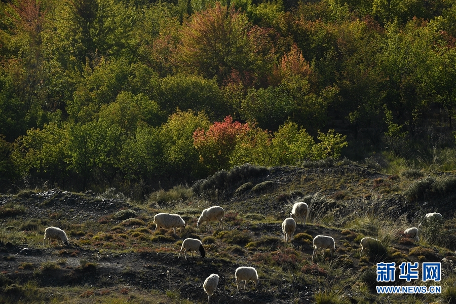 龍羊峽庫區(qū),層林盡染,羊群在山坡上低頭吃草。