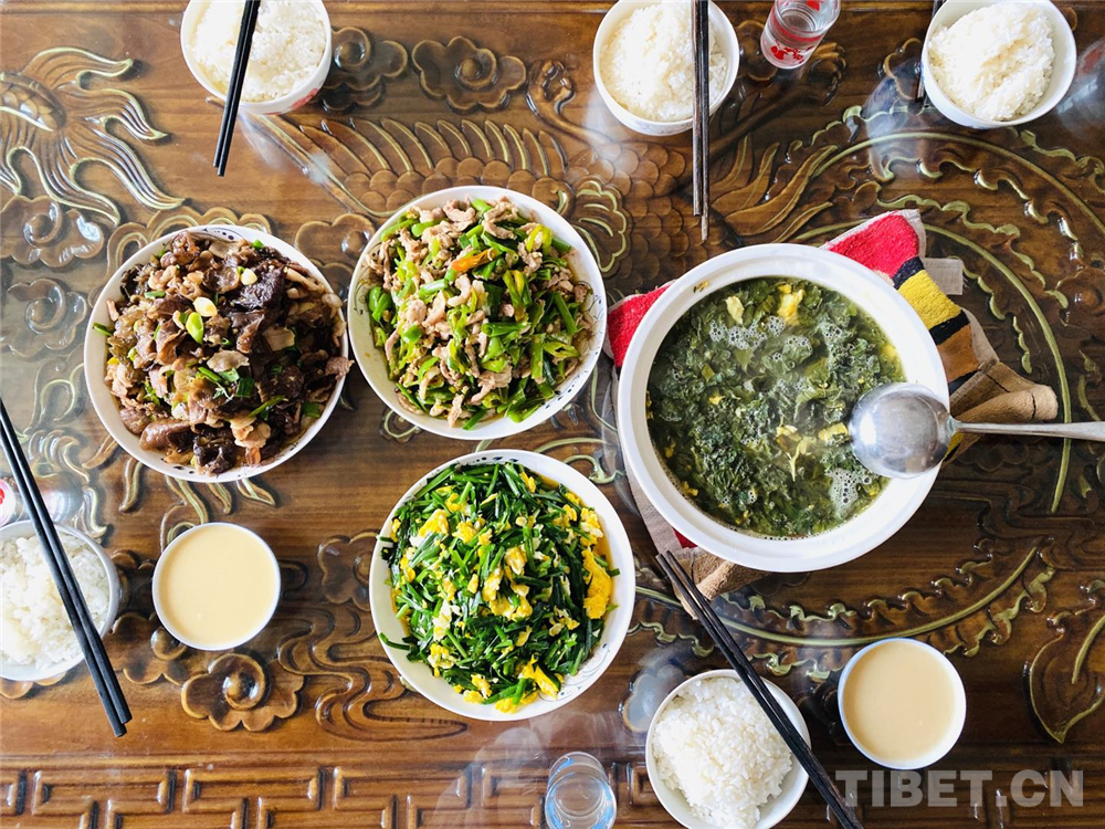 次增做得一手好菜,木耳青椒炒肉、韭菜炒雞蛋,還有蕎麥葉煮蛋湯,家常菜讓人感到非常親切和感動。次增對我們說:“開展生態(tài)宜居示范村建設(shè)后,整個村變化特別大,以前村里的土路高低不平,現(xiàn)在道路平整,路也寬了,給我們帶來了很大的幸福,不是光我一家,我們整個村子家家戶戶都覺得非常滿意。”