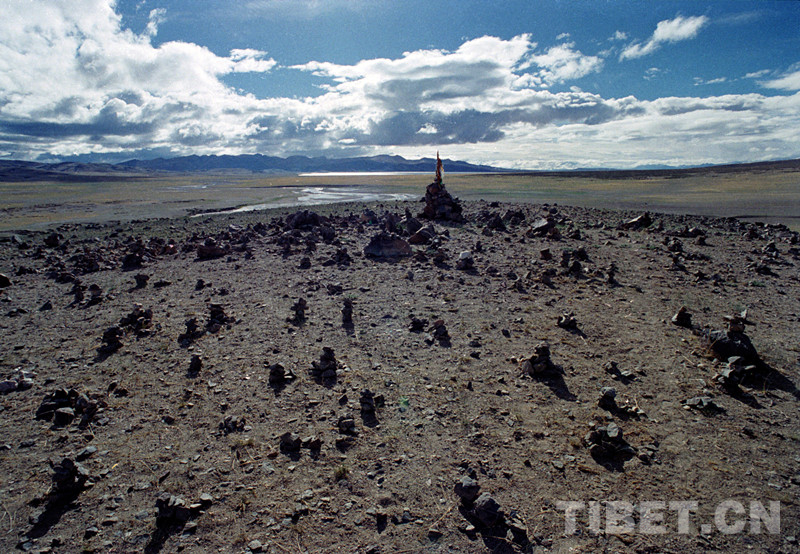 這是遼闊的藏北高原。前景是信教群眾用小石塊壘起的一個個祭天神的小石堆(唐召明1998年攝)