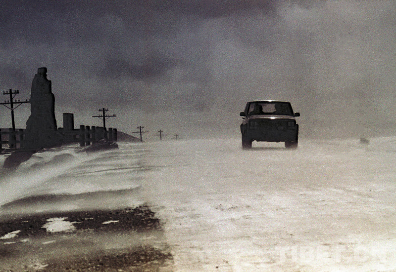 這是一輛汽車(chē)正在通過(guò)風(fēng)雪彌漫的青藏公路最高處唐古拉山口(唐召明1991年冬攝)