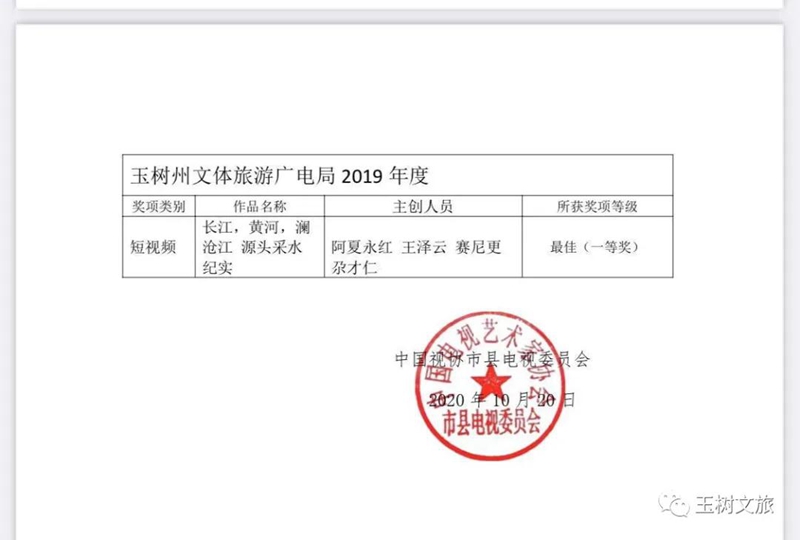 在當(dāng)天舉行的第八屆全國(guó)市縣電視臺(tái)、融媒體中心推優(yōu)展播活動(dòng)表彰晚會(huì)上,全國(guó)100多家市縣電視臺(tái)、融媒體中心的代表和來(lái)自全國(guó)各地的領(lǐng)導(dǎo)、嘉賓齊聚?;顒?dòng)現(xiàn)場(chǎng)頒發(fā)了最佳短視頻單位、最佳電視專題單位、最佳電視欄目單位、最佳綜藝晚會(huì)單位、媒體融合先導(dǎo)單位等獎(jiǎng)項(xiàng)。玉樹(shù)藏族自治州文體旅游廣電局獲最佳短視頻單位,其2019年度短視頻作品《長(zhǎng)江、黃河、瀾滄江源采水紀(jì)實(shí)宣傳片》獲得“最佳短視頻一等獎(jiǎng)”榮譽(yù)。