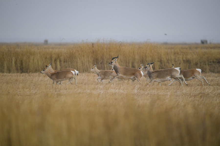 11月20日,一群普氏原羚在青海湖普氏原羚特護區(qū)內(nèi)活動。新華網(wǎng) 潘彬彬 攝