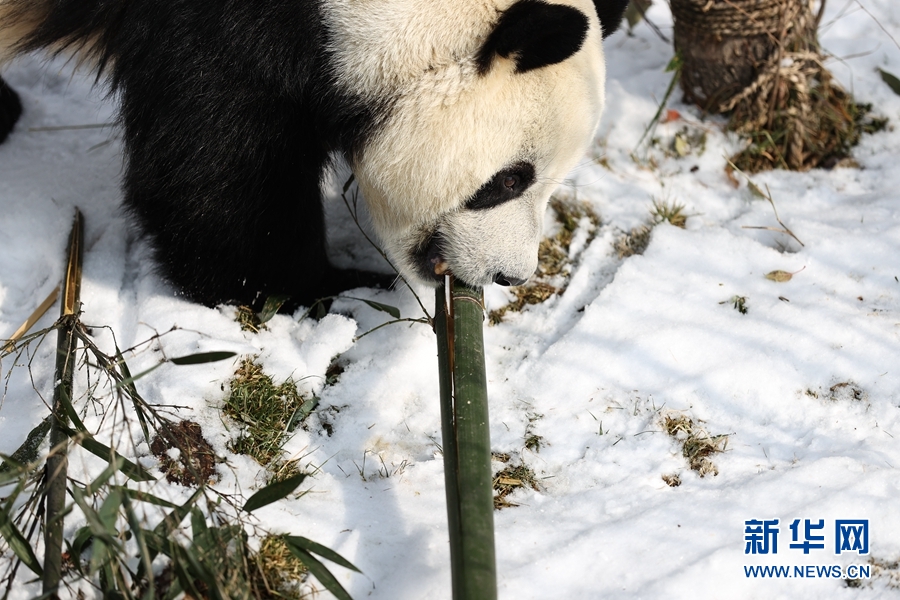 近日,受冷空氣影響,青海省西寧市迎來降雪。西寧熊貓館的四只大熊貓?jiān)谘┨炖锵硎苤灾褡印ⅰ按蝽飪骸钡臉啡ぁ?/p>