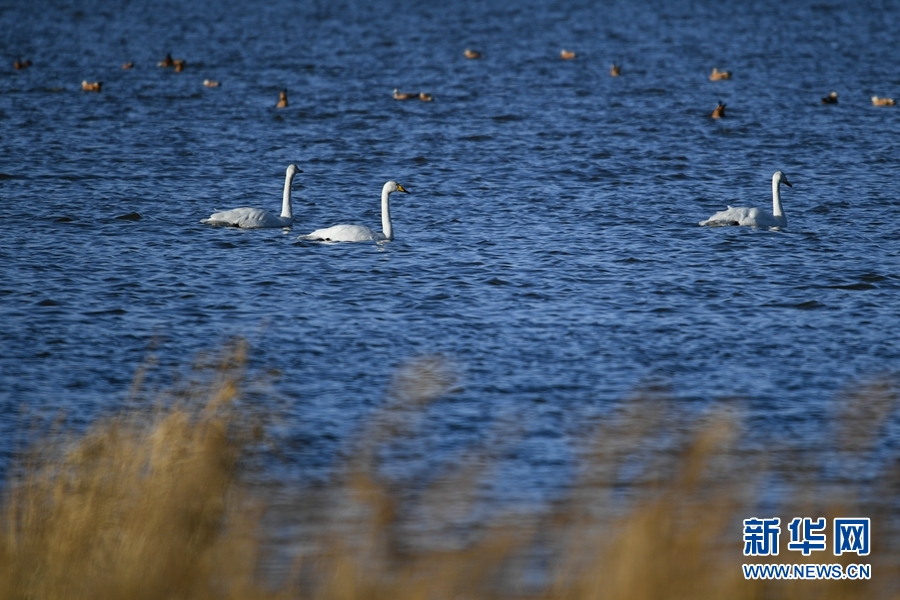 大天鵝、赤麻鴨在都蘭湖游弋。(11月21日攝)新華網(wǎng) 潘彬彬攝
