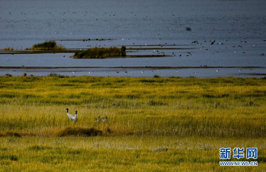 生活在都蘭湖國家濕地公園內(nèi)的黑頸鶴一家。(9月24日攝)新華網(wǎng) 潘彬彬攝