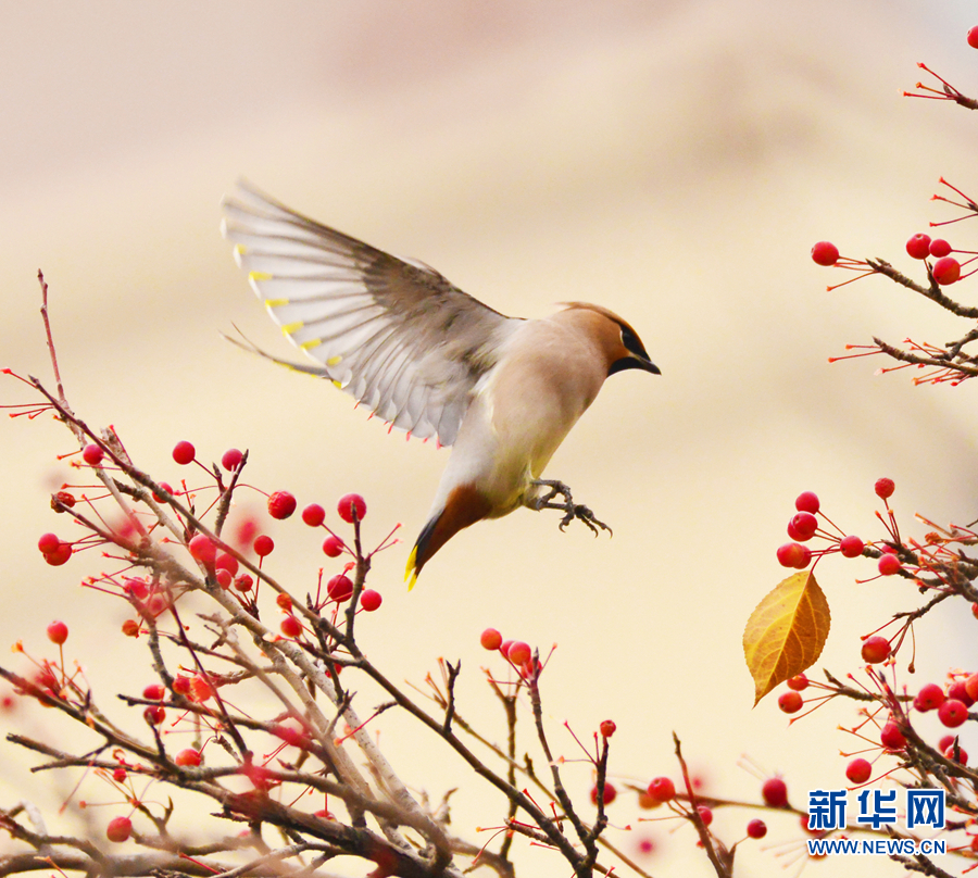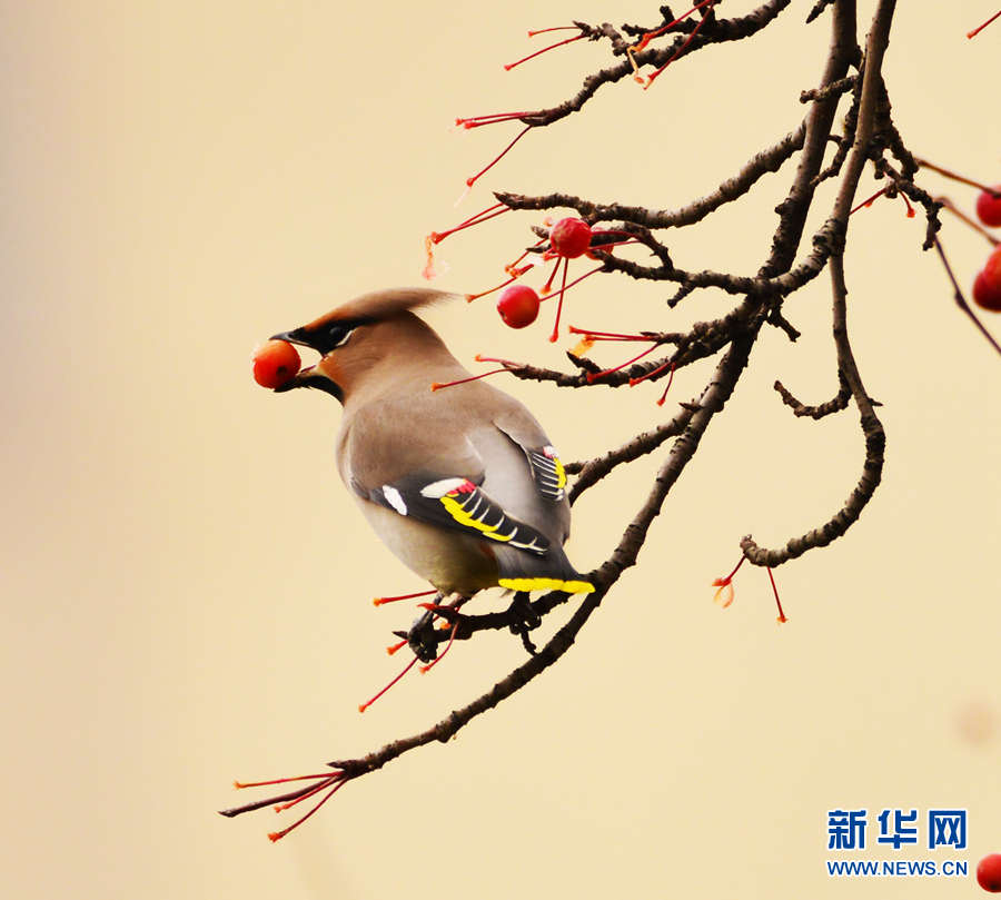 一只太平鳥(niǎo)正銜著一顆海棠果。新華網(wǎng)發(fā)(李崇軒攝)