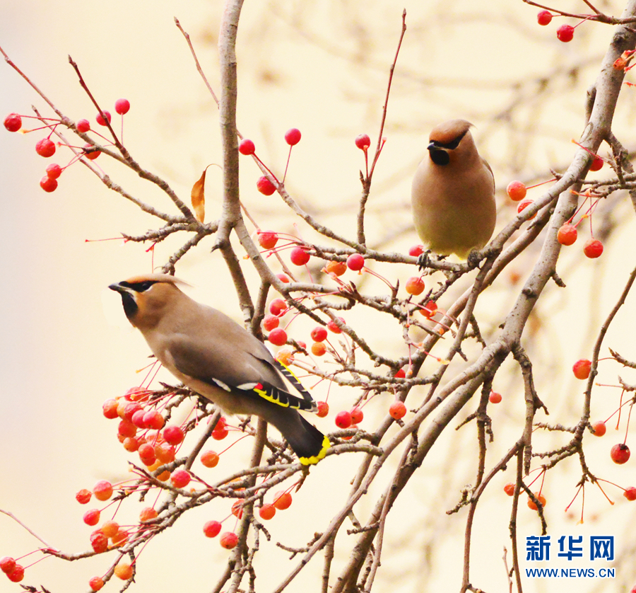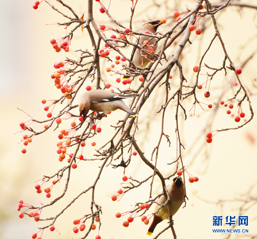 一群太平鳥(niǎo)正在“享用”海棠果。新華網(wǎng)發(fā)(李崇軒攝)