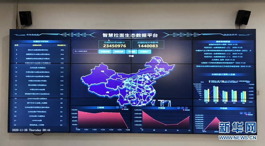 “現(xiàn)在的時間是2020年11月26日09時43分,大屏顯示拉面成交單數(shù)為1440083單,拉面的總營業(yè)額為23450976元。”馬建國告訴記者,化隆縣青海拉面產(chǎn)業(yè)電商服務(wù)中心智慧拉面平臺大數(shù)據(jù)電子屏可以實(shí)時顯示全國上萬家化隆拉面館在線運(yùn)行情況。