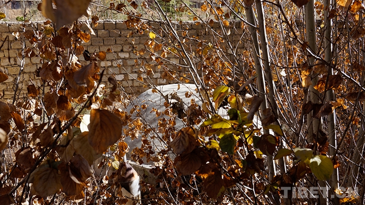小土坡的東側(cè),土墻圍起一個(gè)方形區(qū)域,眼睛穿過黃葉,被樹木圈起的圓堡形墳冢,安葬的是旺青多杰的父親——龔海青。