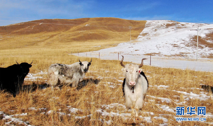在青海省祁連縣,幾頭牦牛在雪后的草原上活動(12月7日攝)。新華社記者 張宏祥 攝