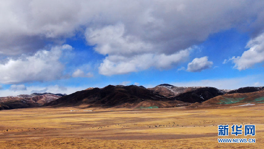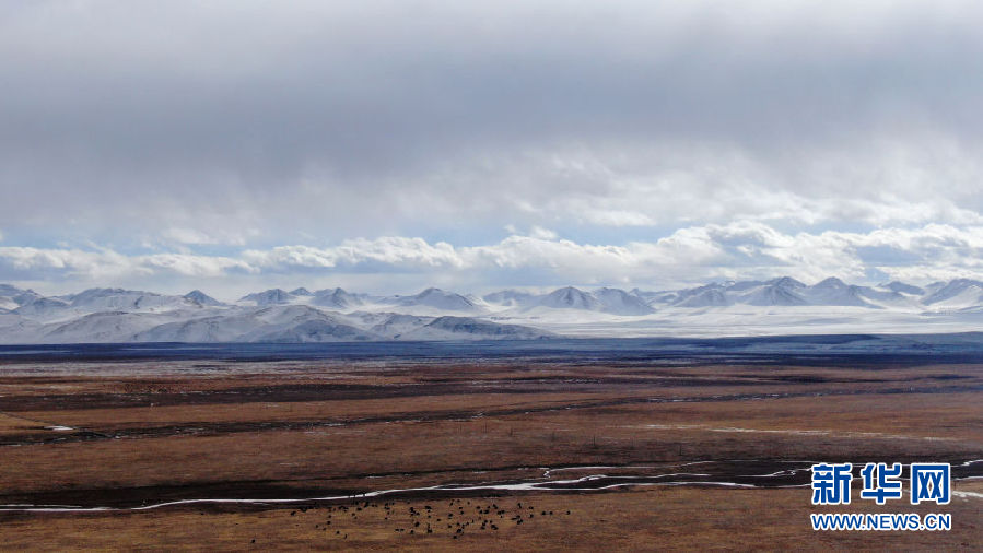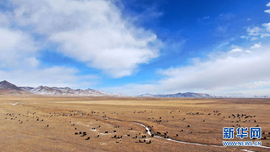 在青海省祁連縣,一群牦牛在草原上活動(12月10日攝,無人機照片)。新華社記者 張宏祥 攝
