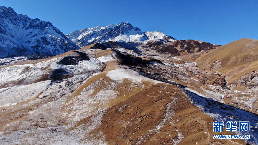 在青海省祁連縣,羊群在雪山下的草原上活動(12月8日攝,無人機照片)。新華社記者 張宏祥 攝