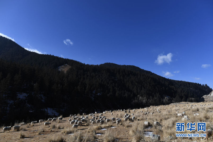 在青海省祁連縣,羊群在草原上覓食(12月10日攝)。新華社記者 張宏祥 攝