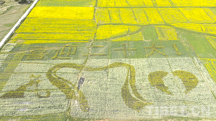 值得一提的是,在扎西崗鄉(xiāng)主會(huì)場(chǎng),當(dāng)?shù)貙⒒牡刂匦麻_(kāi)墾,安排種植了油菜花大地景觀。不同品種、不同顏色的油菜花海為背景的種植,從空中俯瞰形成了“喜迎二十大”“松贊故里 幸福墨竹”字樣和松贊干布、文成公主、哈達(dá)、愛(ài)心等圖樣,表達(dá)當(dāng)?shù)厝罕娤灿h的二十大的美好祝福。