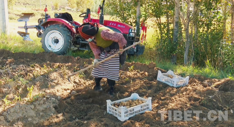 圖為唐嘎鄉(xiāng)窮達(dá)村村民在自家菜地里收土豆