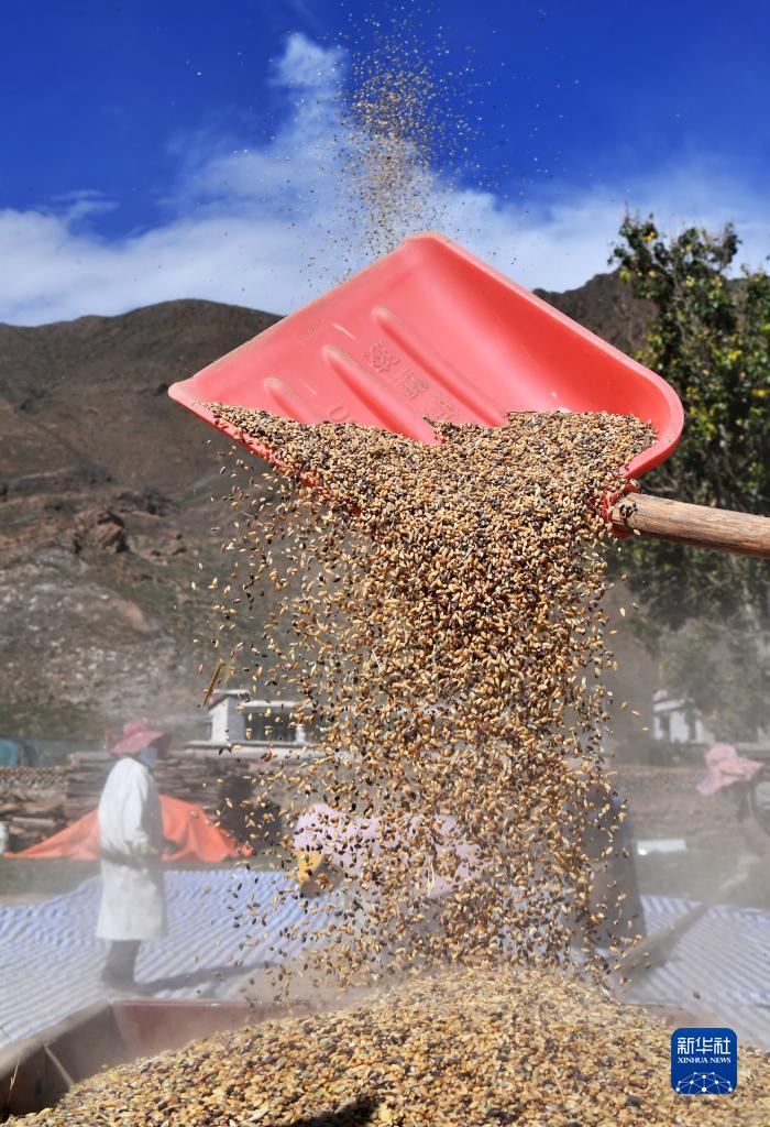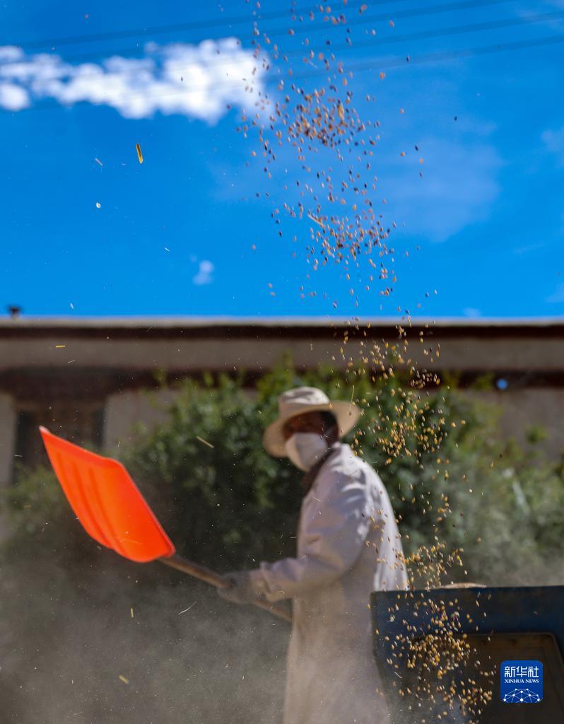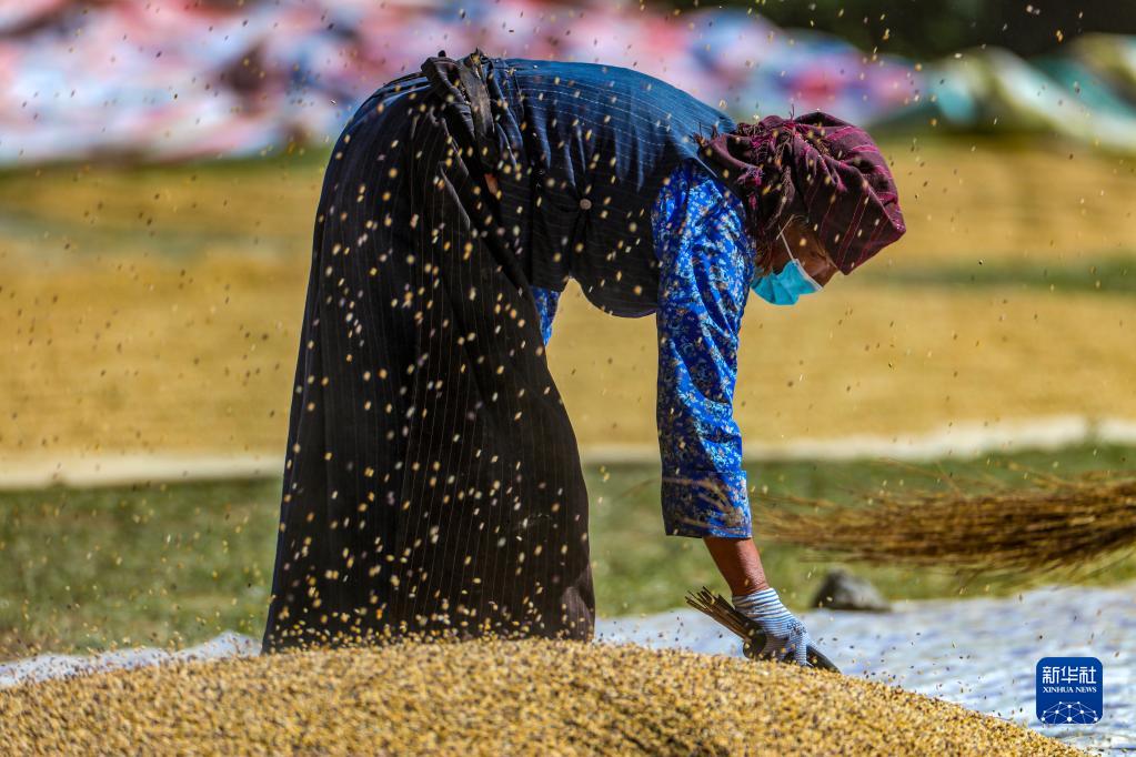 9月21日,拉薩市林周縣江熱夏鄉(xiāng)江夏村的村民在揚場。新華社記者 覺果 攝